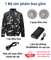 Hiện nay, sản phẩm áo điều hòa ngày càng được thiết kế tinh tế và được nâng cấp về chất lượng sử dụng cũng như thời gian dùng lên rất nhiều. Sản phẩm bao gồm: 2 quạt; 1 pin (chỉ cần sạc 5 – 6 tiếng là đầy, và bạn có thể sử dụng liên tiếp lên tới 12 tiếng đồng hồ); 1 bộ dây kết nối quạt, 1 sạc pin đồng bộ.