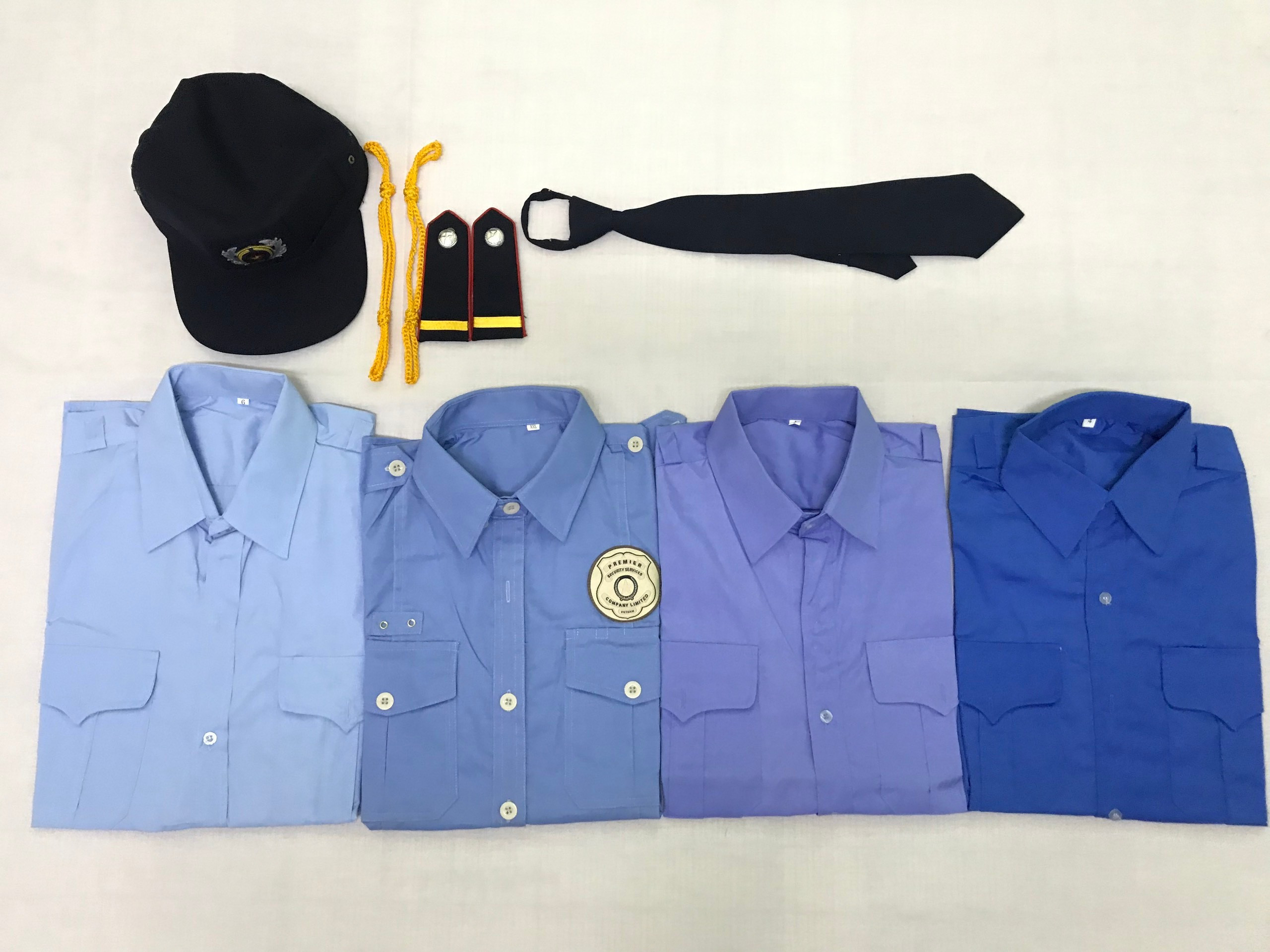 Phụ kiện đi kèm bao gồm logo security, cầu vai, nón bảo vệ, sao, ve áo, cà vạt, giày sĩ quan, gậy cao su